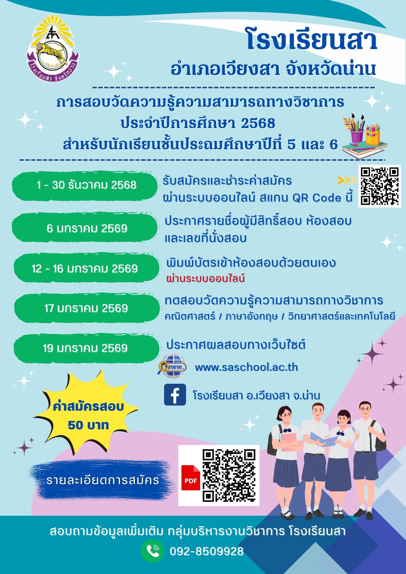 ประชาสัมพันธ์การสอบวัดความรู้ความสามารถทางวิชาการ ระดับชั้นประถมศึกษาปีที่ 5 และ 6 กำหนดการสมัคร: - เปิดรับสมัคร: 1 ธันวาคม 2568 - ปิดรับสมัคร: 30 ธันวาคม 2568 - วันสอบ: 17 มกราคม 2569...